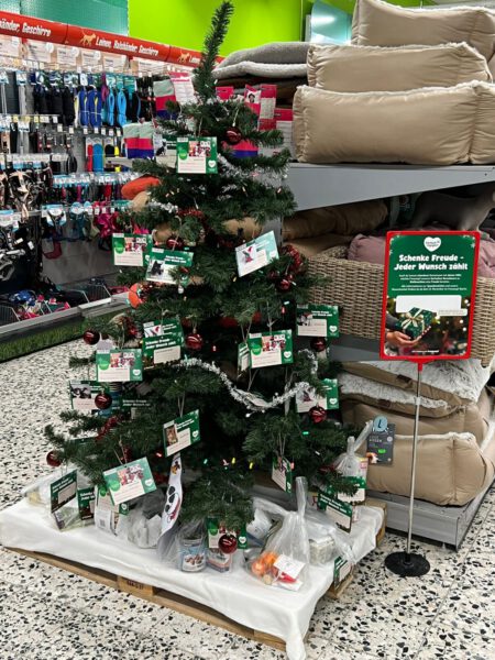 Insgesamt 3 Weihnachtswunschbäume durften wir dieses Jahr für die Tiere, die sich in unserer Obhut befinden, aufstellen und wir freuen uns sehr darüber. Da wir dieses Jahr keine Hunde haben, wollten wir auch mit „unserem“ Baum etwas Gutes tun und haben uns entschieden, den Hunden der Obdachlosen, die durch Hermas Spendenbox betreut werden, auch eine Freude zu machen. Sie haben es in dieser Jahreszeit besonders schwer. Denn in vielen Schlafstellen dürfen keine Hunde mitgebracht werden.
