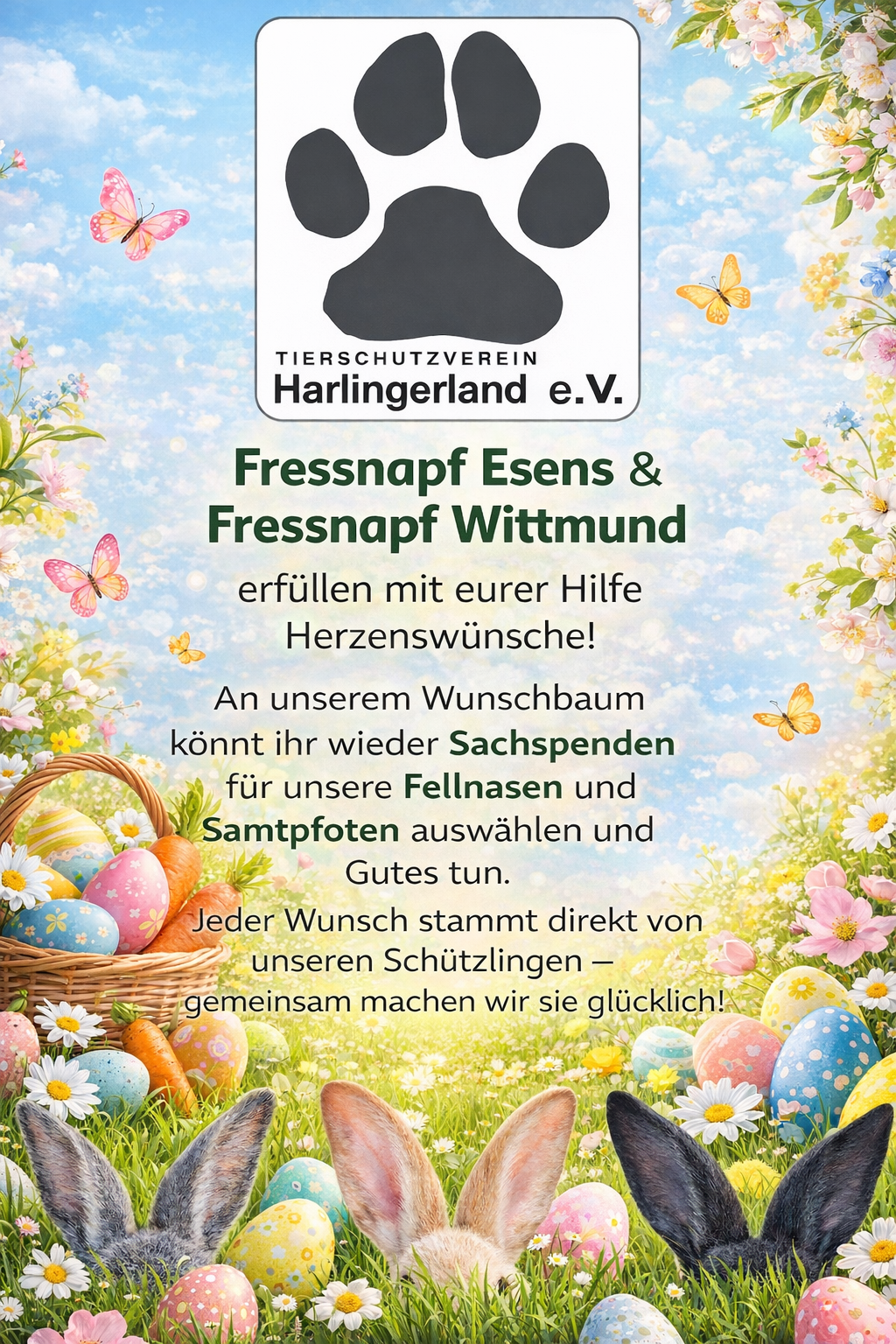 Nachdem die Mitarbeiter/innen und die Fressnapfleitung uns und unsere Tiere schon seit Jahren mit dem Wunschweihnachtsbaum unterstützen, findet jetzt eine ähnliche Aktion zu Ostern statt. Wir freuen uns sehr darüber und sagen